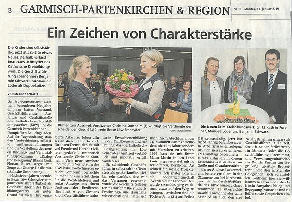 Beim Jahresempfang am 09. Januar war es Zeit, „Vergelt‘s Gott“ zu sagen zu Beate Löw-Schneyder, Geschäftsführerin des KBW von 2012 bis 2018. Beate Löw-Schneyder entwickelte in den zurückliegenden sieben Jahren neben dem „Stamm-Programm“ mehrere innovative Projekte wie z.B. eine Demenzausstellung, das Programm „echtes Bayern“, eine Kirchenführerausbildung auf die Oberammergauer Passionsspiele 2020 hin u.v.m.
